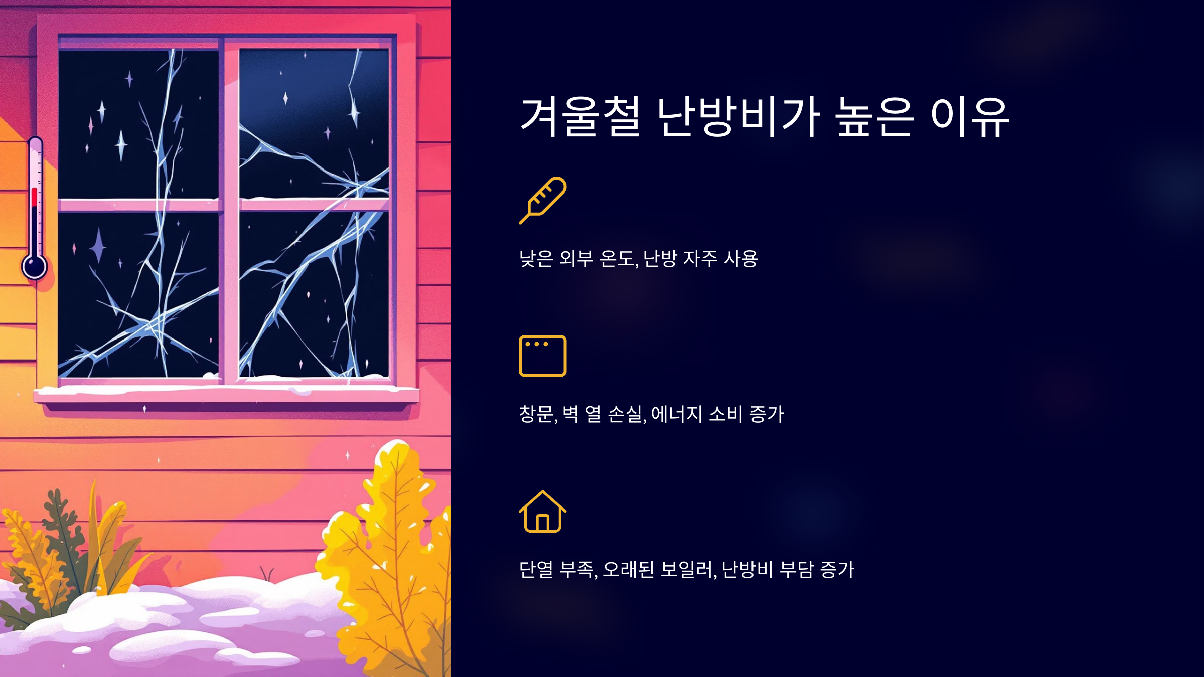 겨울에는 낮은 외부 온도로 인해 난방을 자주 사용하게 되고, 창문이나 벽을 통한 열 손실로 인해 에너지 소비가 더 늘어납니다. 특히 단열이 잘 되지 않은 주택이나 오래된 보일러를 사용하는 경우 난방비 부담이 더 커질 수 있습니다.