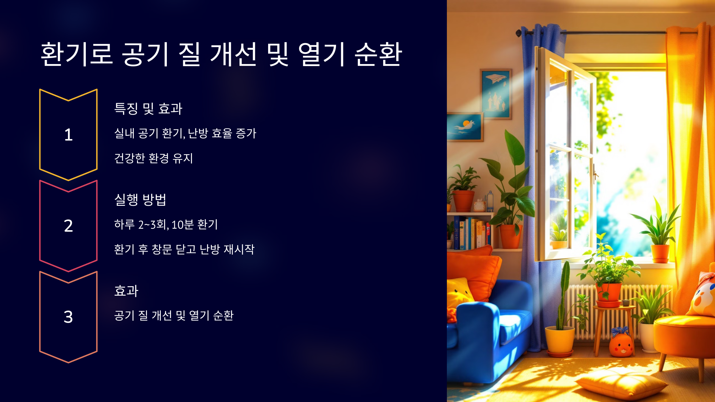• 실내 공기를 환기하면 난방 효율을 높이고 건강한 환경을 유지할 수 있습니다.