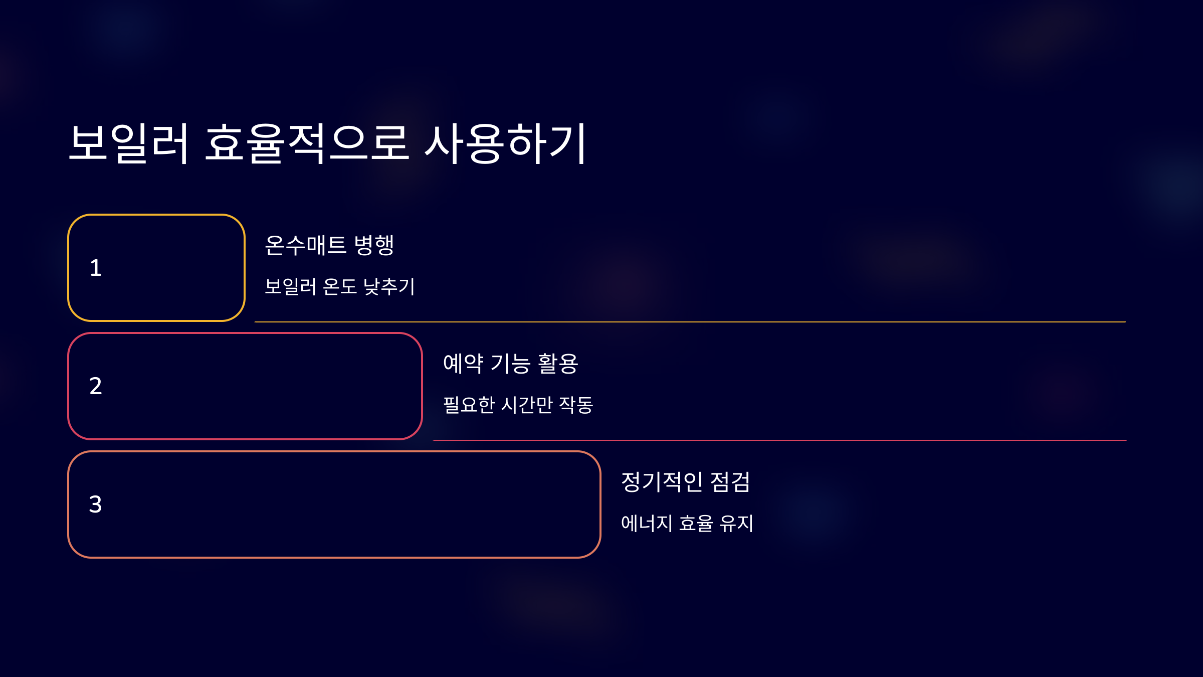 • 예약 기능 활용: 보일러를 계속 켜 두지 말고 예약 기능으로 필요한 시간에만 작동시킵니다.