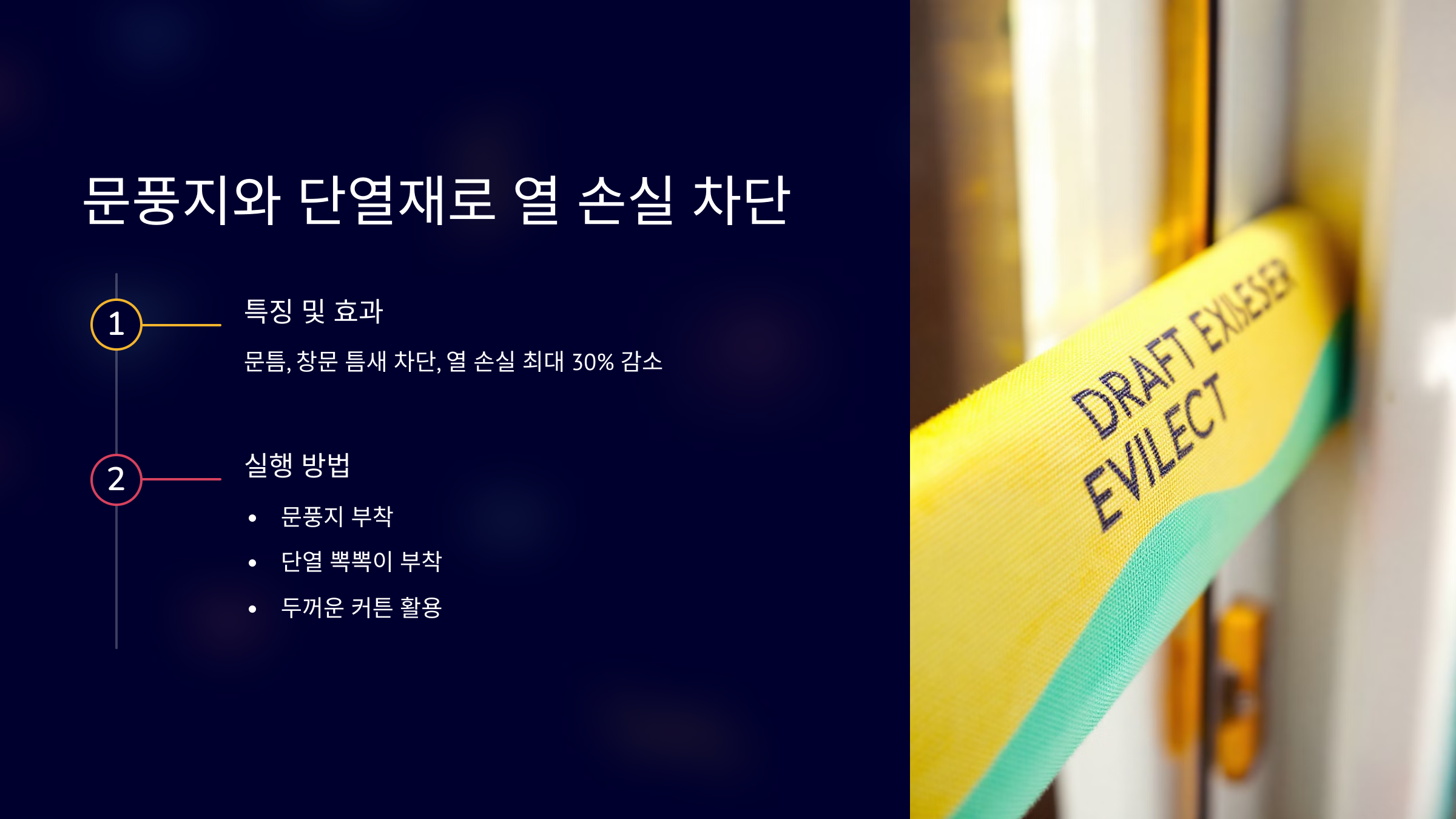 • 문틈, 창문 틈새를 막으면 열 손실을 최대 30% 이상 줄일 수 있습니다.