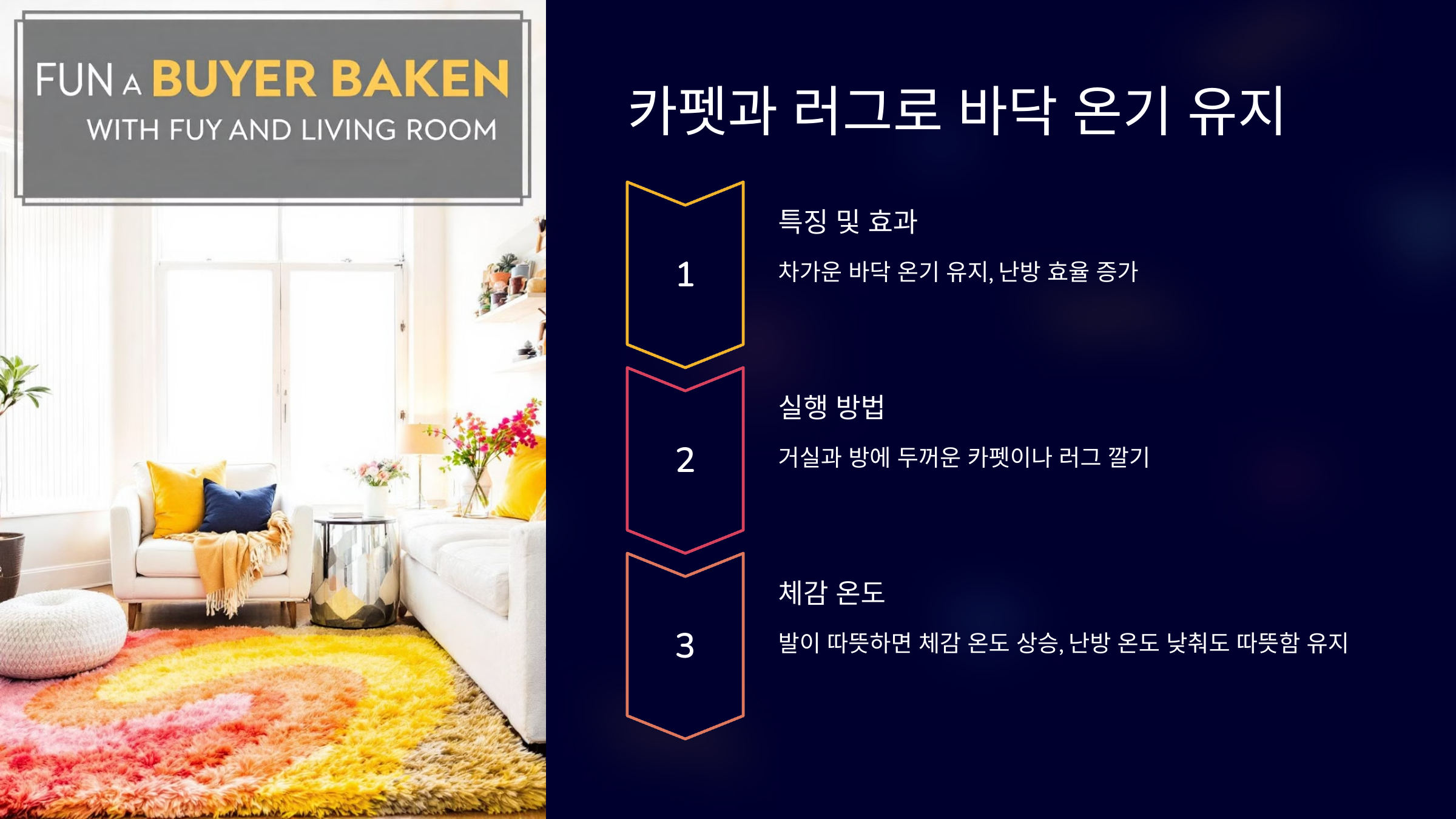 • 거실과 방에 두꺼운 카펫이나 러그를 깔아 바닥에서 올라오는 한기를 줄이세요.