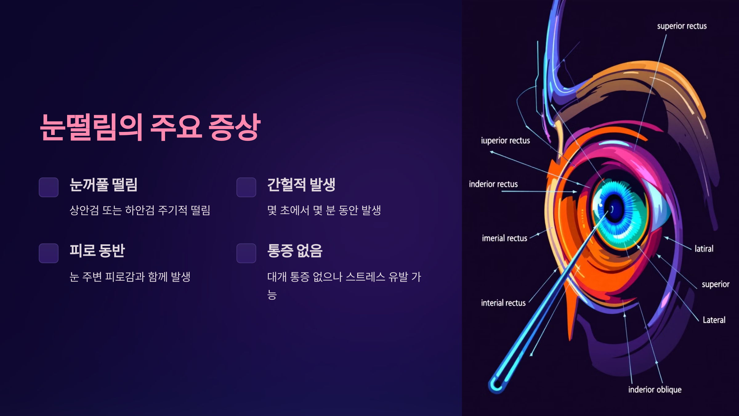 눈떨림의 일반적인 증상은 아래와 같습니다: