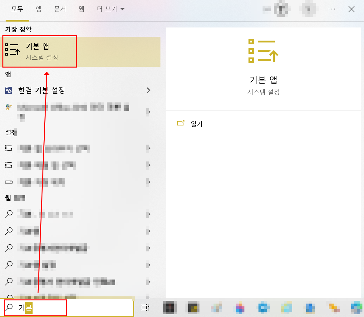 기본 브라우저를 크롬으로 변경하려면 기본 앱(시스템 설정)으로 가주셔야 합니다. 먼저 키보드의 윈도우 키를 눌러주세요. 그럼 찾기에 마우스 커서가 깜빡 깜빡 거릴 거예요. 검색창에 기본이라고 입력하면 상단에 기본 앱(시스템 설정)이 보이실 거예요. 그걸 클릭해 주세요.