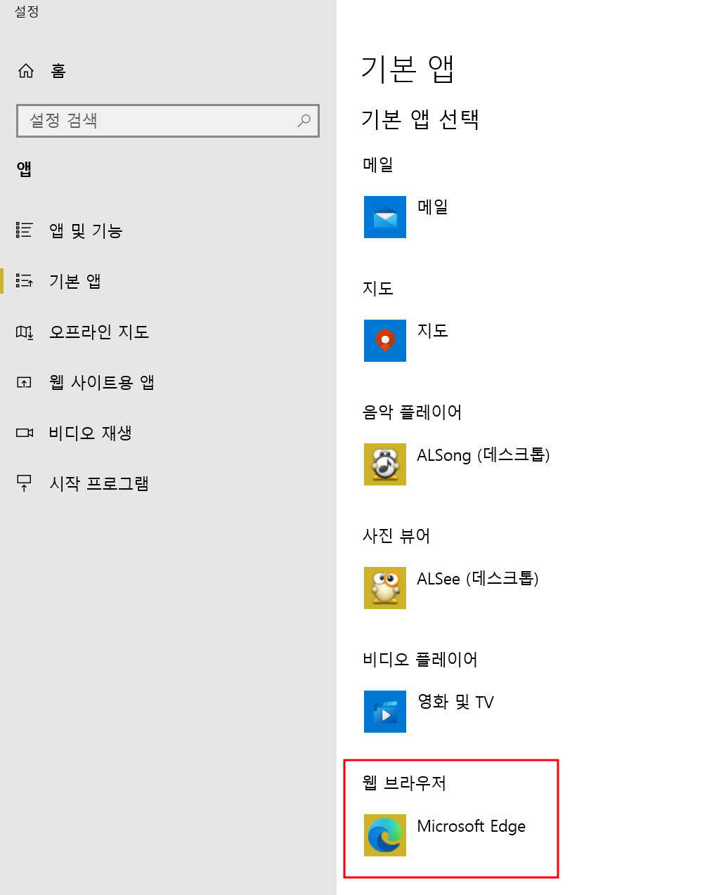 그러면 기본앱 설정 창이 뜨는데요. 조금 아래 부분을 살펴보면 웹 브라우저라고 되어 있는 부분이 있을 거예요.