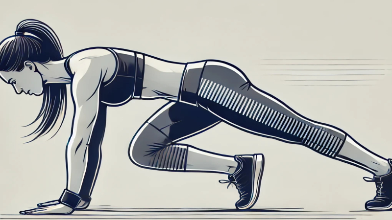 ✅ 방법: 팔굽혀펴기 자세에서 한쪽 무릎을 가슴 쪽으로 당기며 빠르게 교차