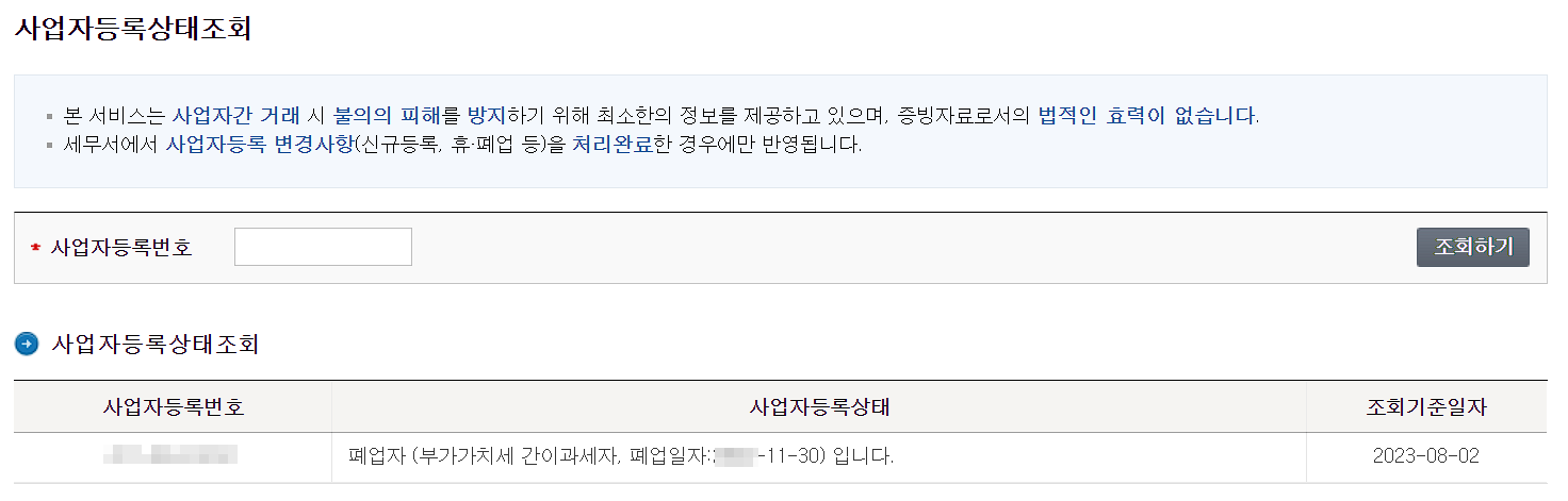 국세청에 등록되지 않은 사업자등록번호일 경우나 폐업일 경우 정상 거래가 어려우니 거래에 유의하시기 바랍니다.