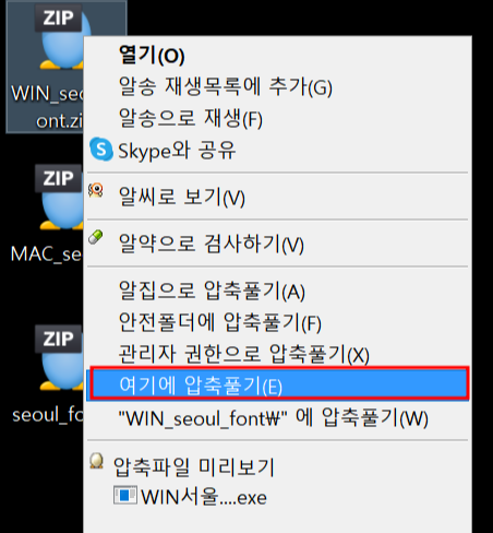 본인 컴퓨터에 맞는 서체의 파일 다운로드합니다. 파일(.zip)에 마우스 포인트를 올려 놓고 여기에 압축풀기를 실행합니다.
