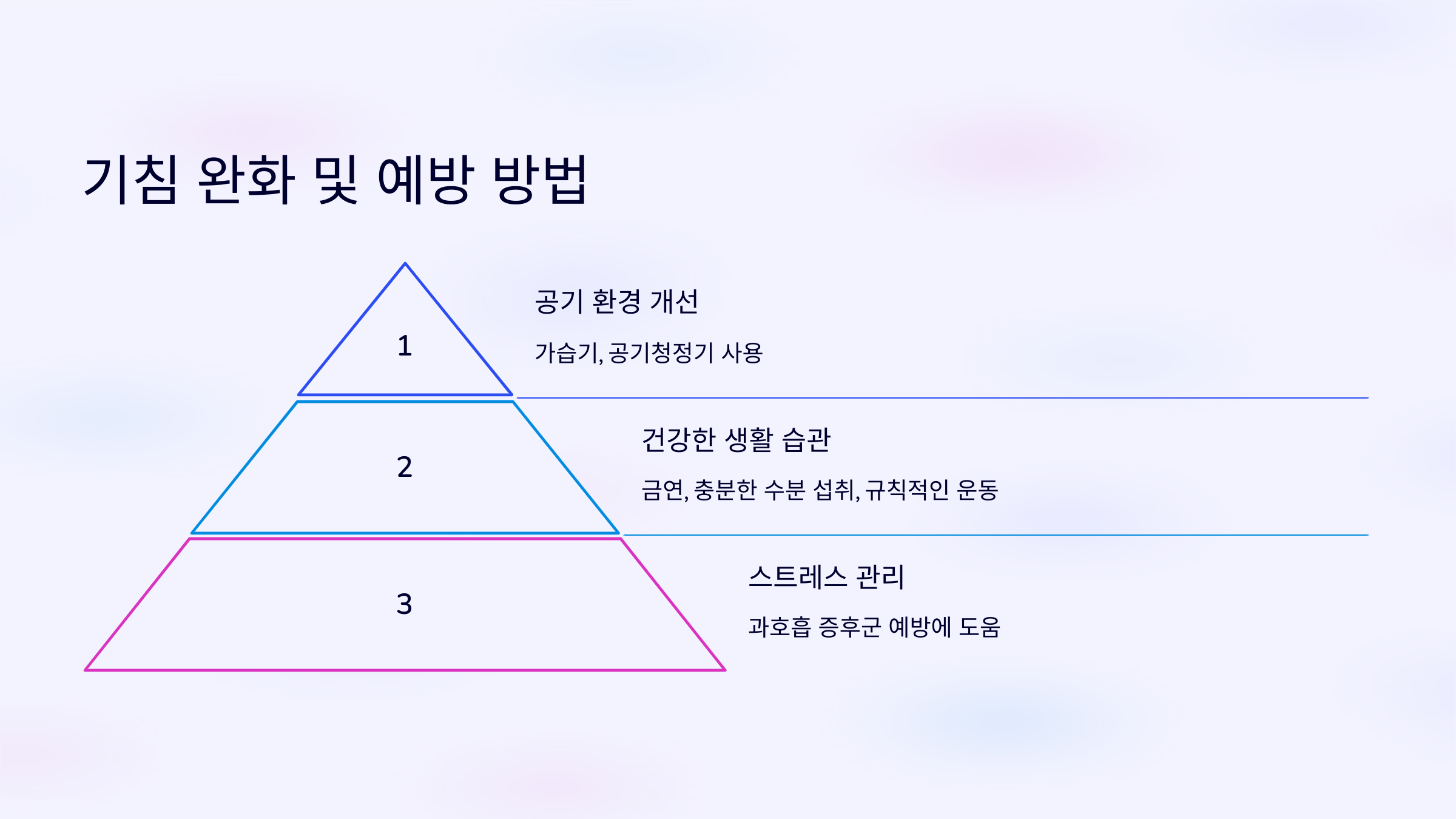 예방을 위해 공기 환경을 개선하고, 금연 및 스트레스 관리를 실천하세요.