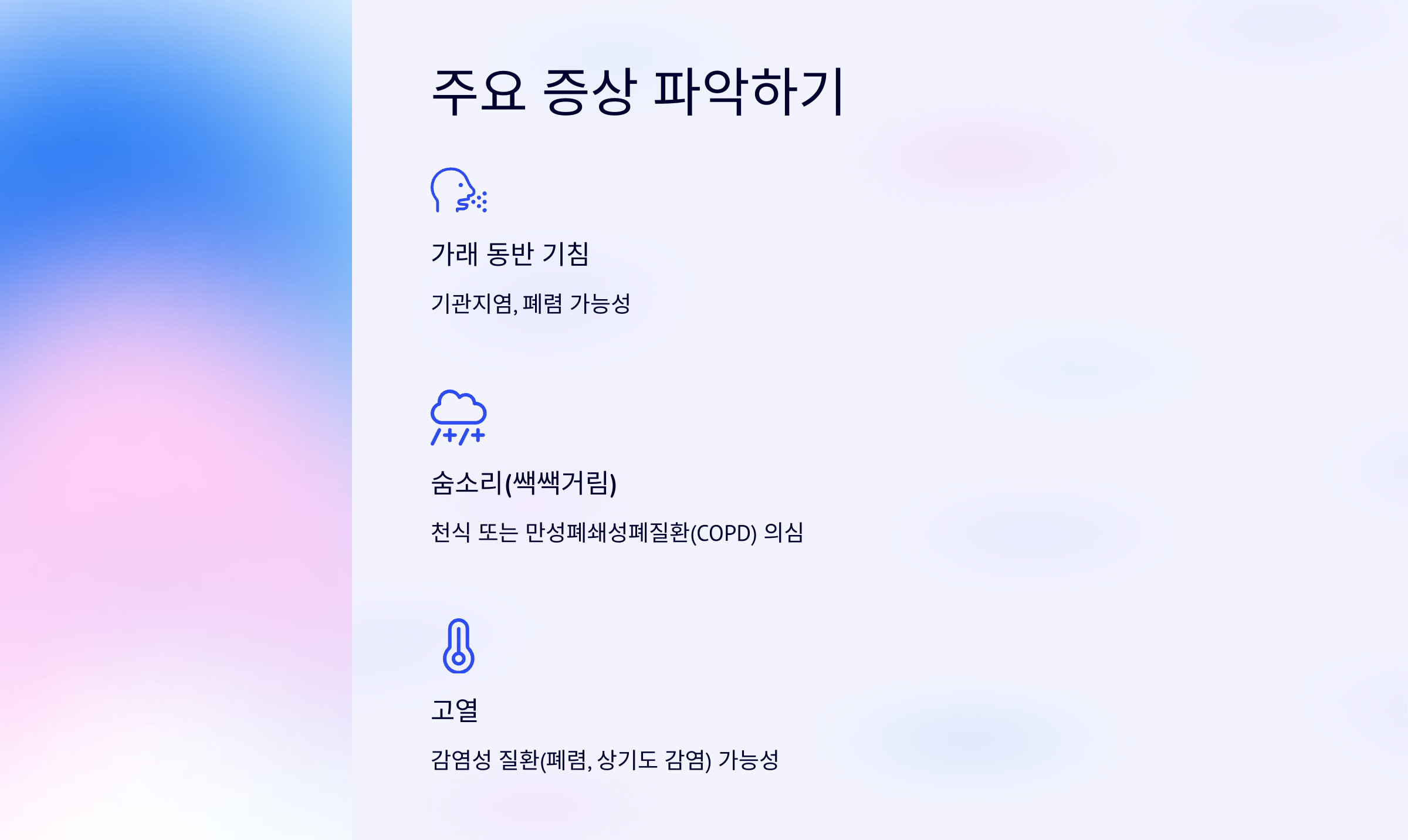 숨소리(쌕쌕거림): 천식 또는 만성폐쇄성폐질환(COPD) 의심.