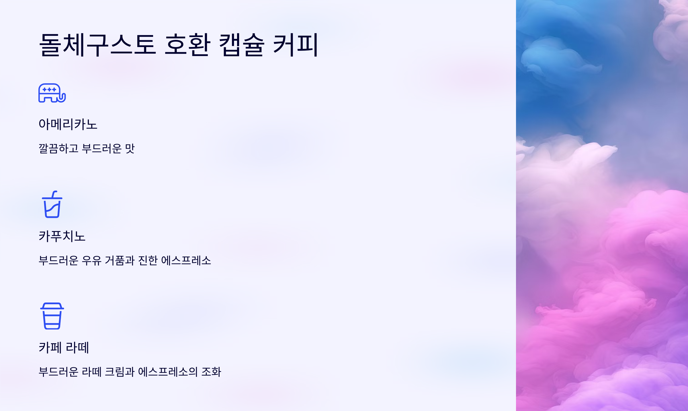 자신의 커피 취향과 라이프스타일에 맞는 캡슐을 선택해 홈카페를 완성해보세요!