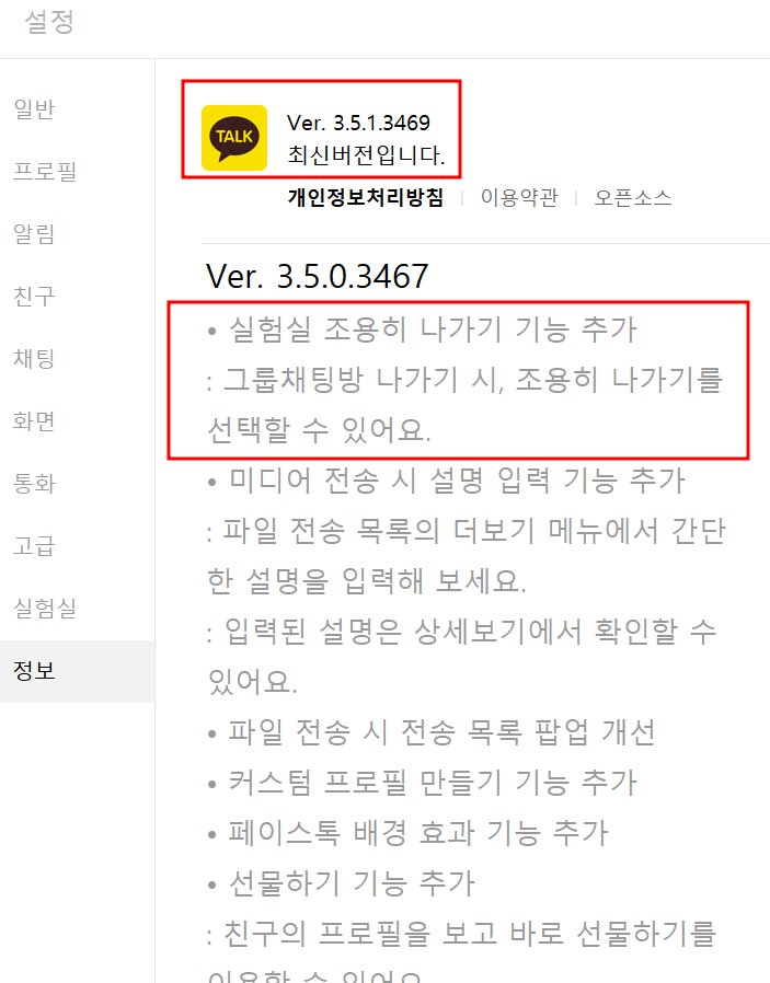 카카오의 카카오톡 PC버전 설정의 정보에서도 실험실 조용히 나가기 기능이 추가 되었는지 확인하실 수 있습니다. 카카오톡 PC버전이 없으신 분들은 아래 링크에서 다운로드 받으셔서 설치하시기 바랍니다.