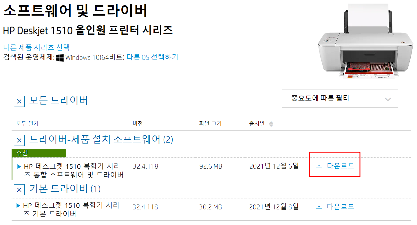 검색결과에 해당하는 프린터 모델을 클릭하여 해당 모델의 지원페이지로 이동합니다. 여기에서 본인의 운영체제에 맞는 것을 선택하고 다운로드 버튼을 클릭합니다.