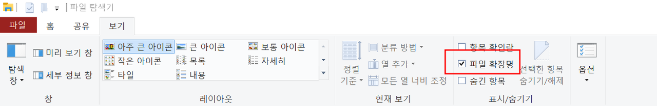 ※ 확장자가 보이지 않을 경우에는 파일탐색기>보기에서 파일 확장명을 체크해 줍니다.